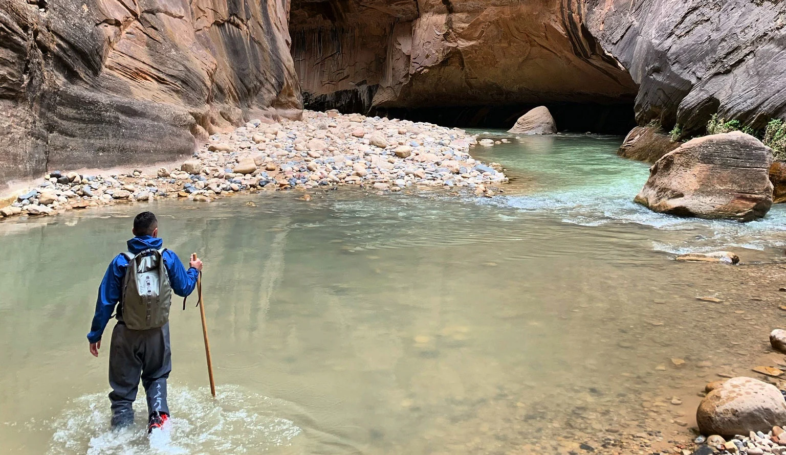 A person wearing outdoor gear and carrying a walking stick wades through a shallow river inside a narrow canyon with rocky walls and a mix of water and stones.