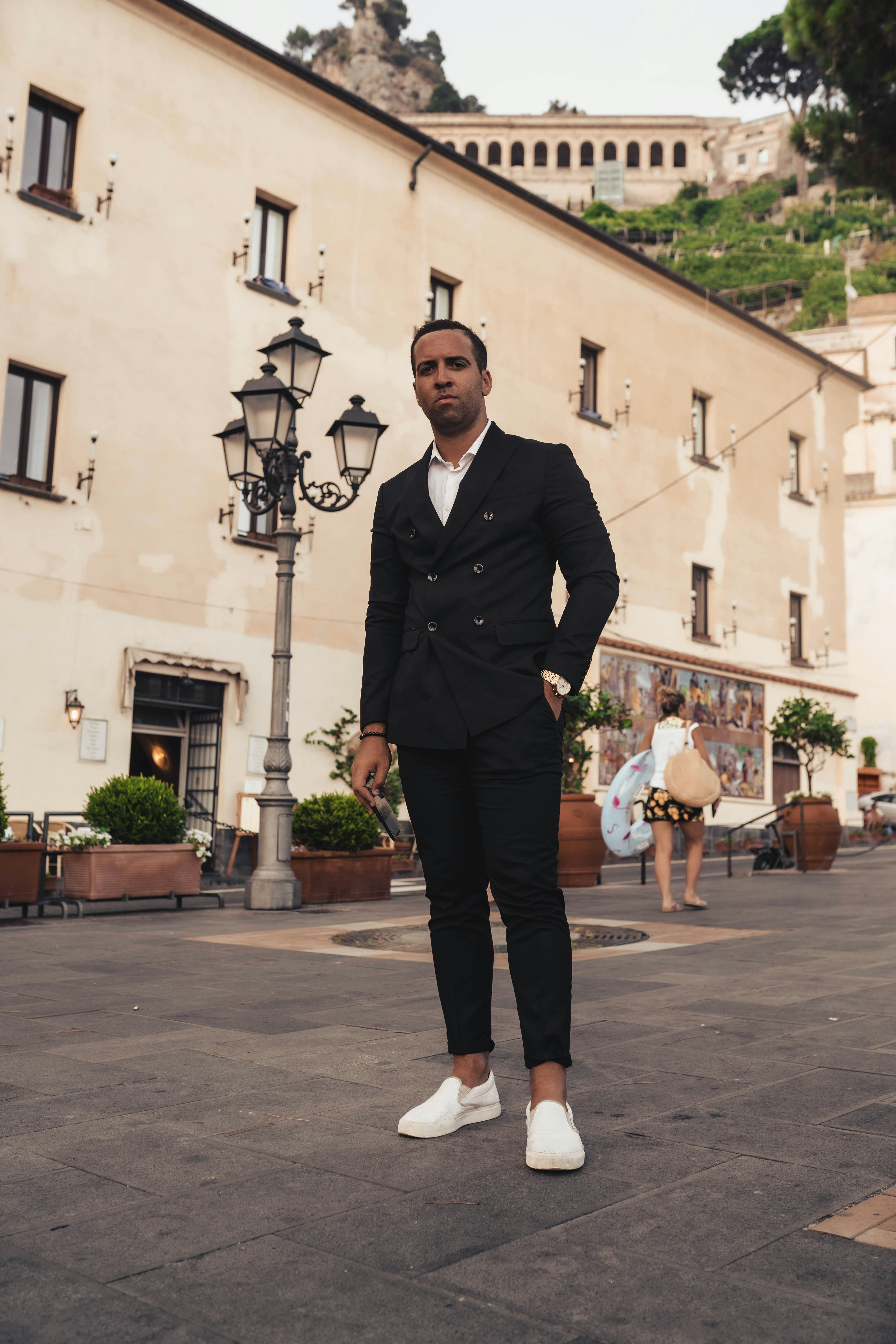 Stick with simpler fits: think slim or tapered chinos, bombers or unstructured blazers, button-fronts, fitted tees or polos, and a dressier sneaker or classic dress shoe.